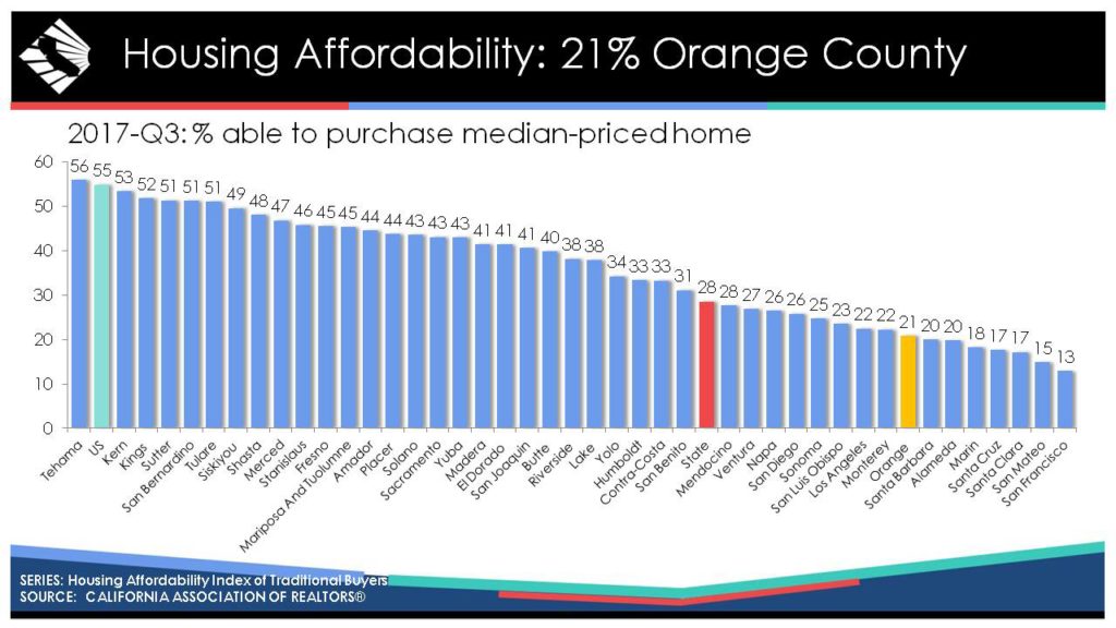 Affordability is the next area of examination. In our local market, defined as Newport Beach, Eastside Costa Mesa, Corona del Mar and Newport Coast, we ended 2017 with an aggressive growth of 10% in our average sales price of a single family home. It currently costs a buyer $2,833,102 on average to enter this market, that is 23% higher than our last market highpoint in 2007. * When you take a look at the chart below, Orange County has a 21% affordability rate only yielding to a few high profile bay areas.