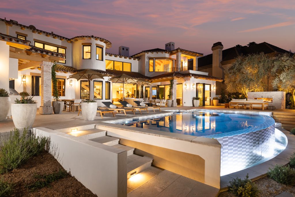 Set in the prestigious guard-gated community of Bear Brand Ranch, 7 Searidge is a magnificent showcase of Spanish transitional architecture, offering unparalleled coastal living with breathtaking views of the Pacific Ocean, Catalina Island, and the sparkling city lights of South Orange County. An exceptional custom rebuild designed by leading local designer Laura Brophy sets the standard for chic and refined living. Spanning 8,151 square feet, this custom-built estate features six bedrooms, eight bathrooms, a dedicated office, media room, bar, gym, and a separate ocean-view casita. Every space of the home has been meticulously crafted with luxurious materials and thoughtful design. Upon arrival, a private courtyard framed by mature olive trees and a tranquil stone fountain sets the stage for the elegance within. A grand steel-and-glass pivot door opens to reveal a double-height foyer with European oak floors, a custom chandelier, a double-sided glass wine cellar, and a dramatic staircase. The great room boasts soaring vaulted ceilings, skylights, and a double-sided brick fireplace, seamlessly connecting the kitchen, bar, and outdoor living spaces. The chef’s kitchen is a true statement, with European Black-and-White marble floors, two expansive Calacatta Monet marble islands, and top-of-the-line Thermador appliances. Custom cabinetry and millwork enhance the design, while the brand name Galley Sink and pass-through window create the perfect setting for hosting. The main floor also includes an attached ocean-view casita, complete with a private entrance, coffee bar, fridge, and luxurious bath. Upstairs, a media room and three en-suite guest rooms offer privacy, style and comfort, with two of the rooms featuring panoramic ocean views. Adjacent is the incredible laundry room featuring a gift wrapping station and ocean view. The primary suite is a private sanctuary, accessed through reclaimed wood doors. A coffee and wet bar lead into the spacious suite, where wood ceilings, a chandelier, and a fireplace create a warm and inviting atmosphere. The spa-like primary bath features Spanish mosaic tiles, dual marble vanities, an oversized soaking tub, and intricate shower tile work. La Cantina doors open to the expansive backyard, where an infinity-edge pool/spa, outdoor kitchen and fireplace, and lush gardens create a renowned lifestyle. Property includes gated cobblestone driveway with 4 car garage, and top of line AV and security systems. Shown by appointment.